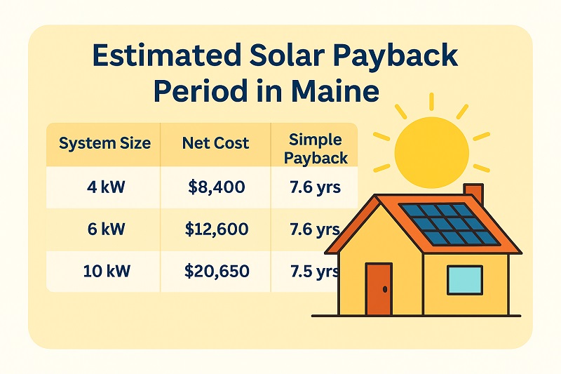 Example: A 6 kW array producing 7,500 kWh/year offsets roughly $1,650 at CMP’s current 22¢/kWh residential rate.